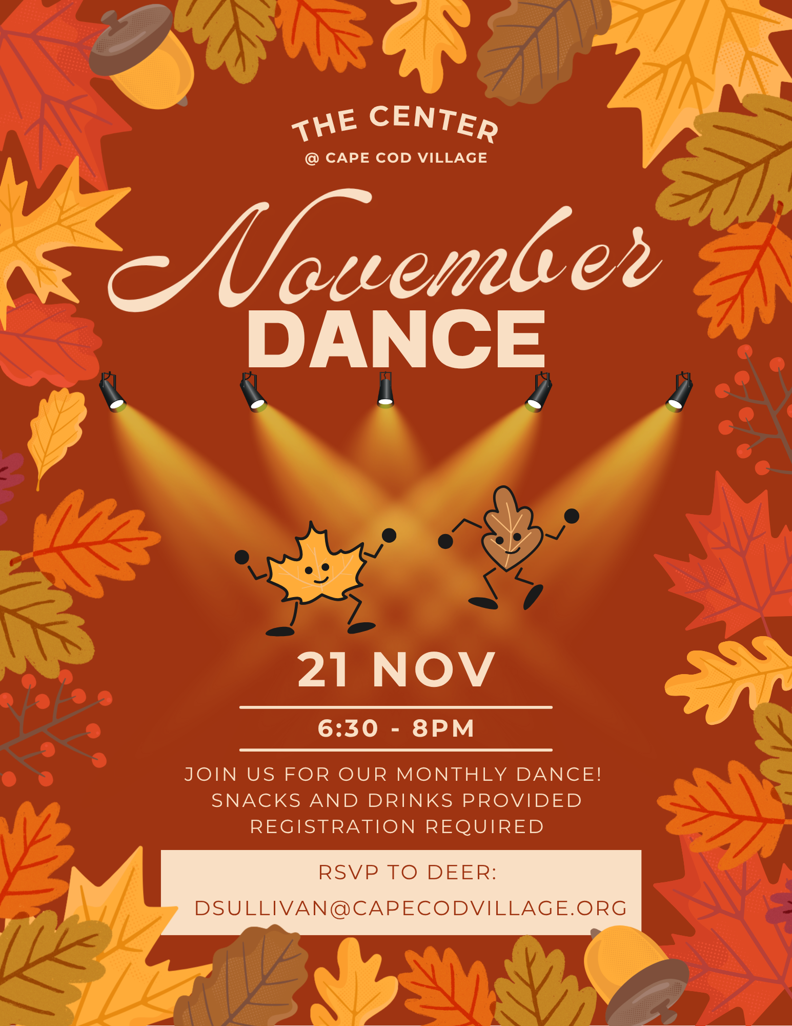 The Center is open to ideas for events and programs from our participants and community members. If you have an idea for a group, or are in need of a group, please contact deer at dsullivan@capecodvillage.org